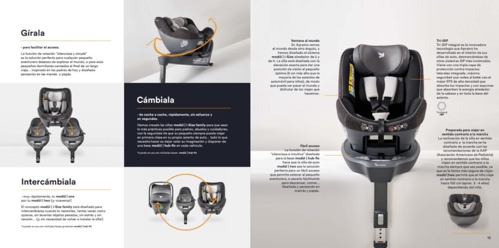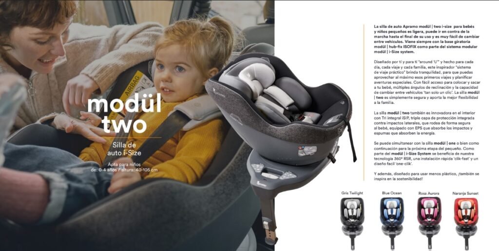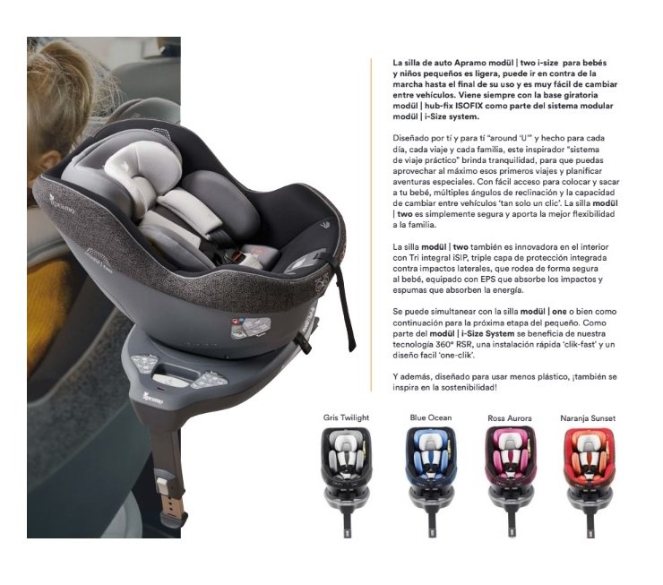 La silla de auto Apramo modül two i-size para bebés y niños pequeños es ligera, puede ir en contra de la marcha hasta el final 4 años de su uso y es muy fácil de cambiar entre vehículos