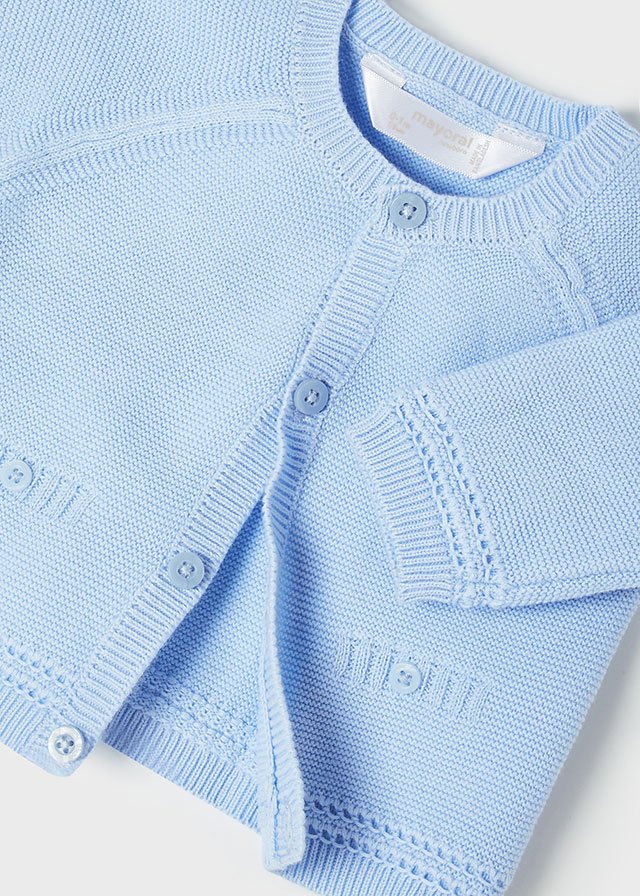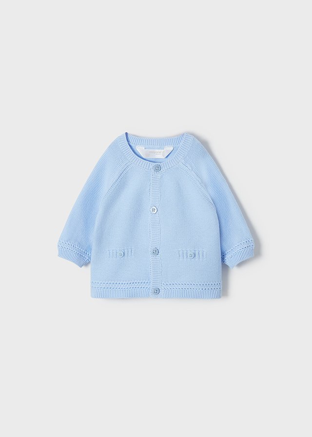 Prenda ECOFRIENDS 100% algodón orgánico. Chaqueta de tipo cardigan de manga larga para recién nacido niño. Cuello redondo. Largo a la cintura. Cierre con botones. Bolsillo simulado decorativo en la parte delantera.