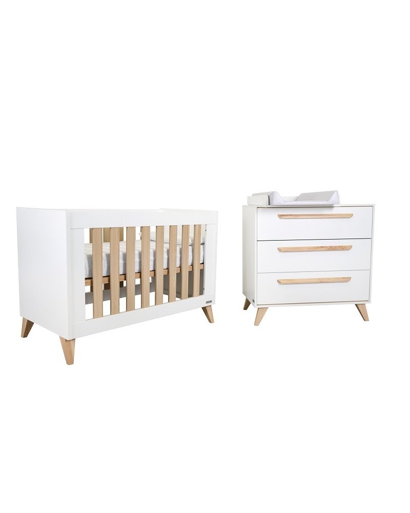 El estilo nórdico de la Cómoda Lazio de IKiD combina de forma moderna la madera natural de las patas y los tiradores o barrotes con la base blanco o gris disponibles para elegir. Puedes decorar por completo la habitación de tu bebé combinando como más te guste los muebles de la Colección Lazio.