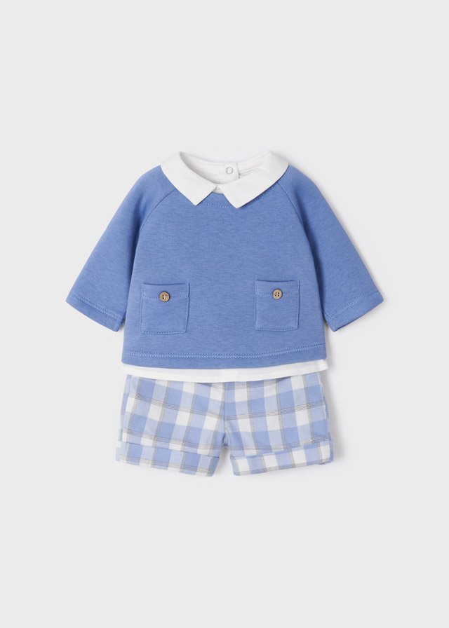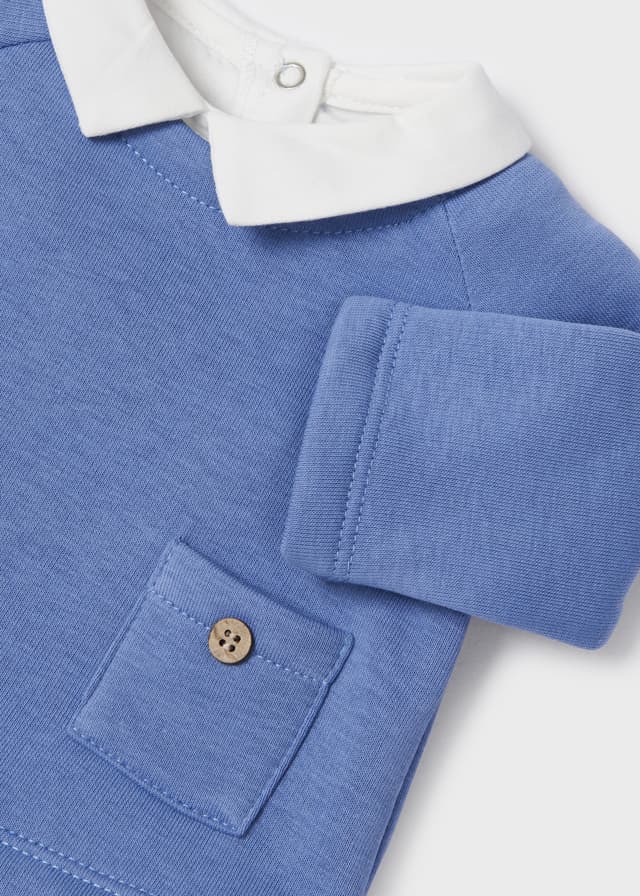 Sudadera de manga larga para recién nacido. Cuello con tejido a contraste. Cierre con botones a presión en la parte posterior para facilitar la puesta de la prenda. Cómodo tejido de punto. Diseño con tejido a contraste en el bajo de la prenda. Bolsillos funcionales en la parte delantera.