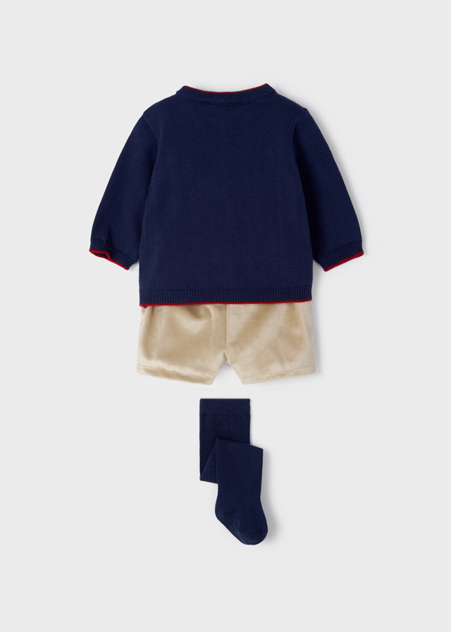 Prenda ECOFRIENDS 100% algodón orgánico. Este conjunto de tres piezas para recién nacido se compone de un bonito jersey a juego con unos pantalones cortos y leotardos combinados.