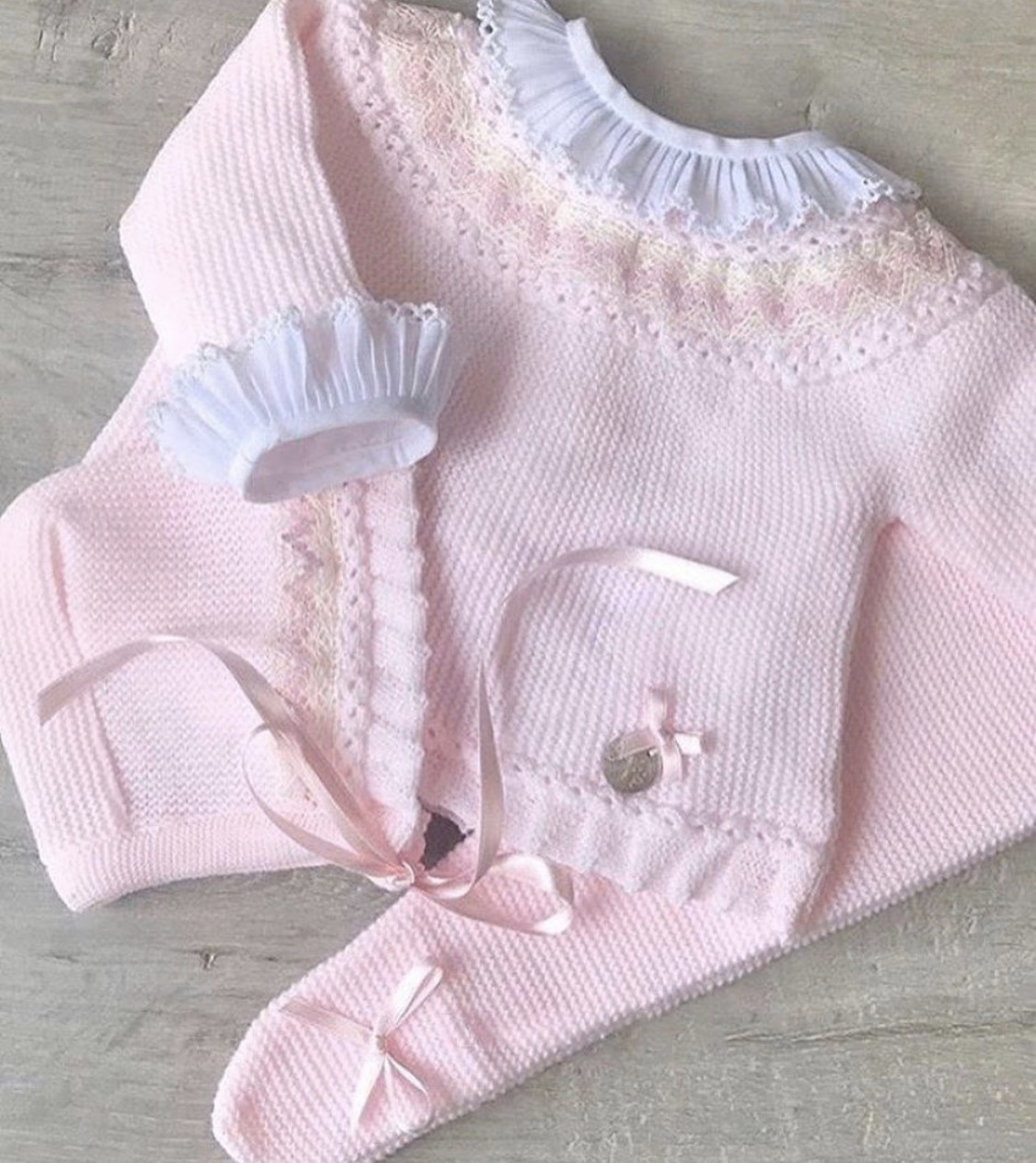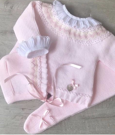 Conjunto Rosa con detalles en 3 piezas. Se fabrica en HILO ( hilo sirve para todo el año aunque hay modelos que se fabrica en lana fina ( consulta modelos de lana en 608580095 WhatsApp ) , como saben la calidad no se puede encontrar tan fácil , tenemos miles de clientes ya satisfechos de sacar o bautizar sus bebés en nuestros conjuntos especiales para sus para pieles atópicas !