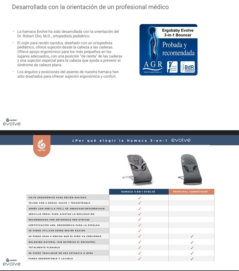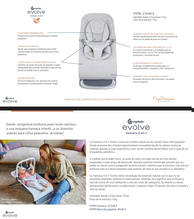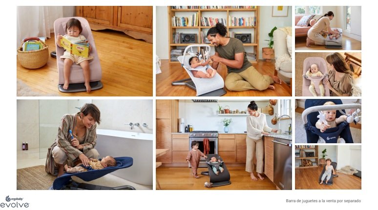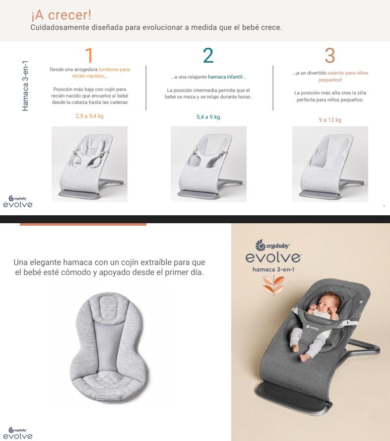 Nuestra hamaca 3 en 1 Evolve !crece con el bebé desde que nace (mínimo 2,5 kg) hasta los 13,2 kg. Puede utilizarla desde el nacimiento con nuestro cojín para recién nacidos, aprobado por un ortopedista pediátrico, que sujeta al bebé desde la cabeza a las caderas. A medida que el bebé crece, puede disfrutar de la hamaca para descansar cómodamente, balancearse o jugar con la barra de juguetes. Con los años, tus pequeños pueden seguir usando la hamaca Evolve como silla para niños, perfecta para relajarse. En el caso de bebés con poco peso o niños con problemas médicos, se debe consultar a un profesional sanitario antes de usar el producto.