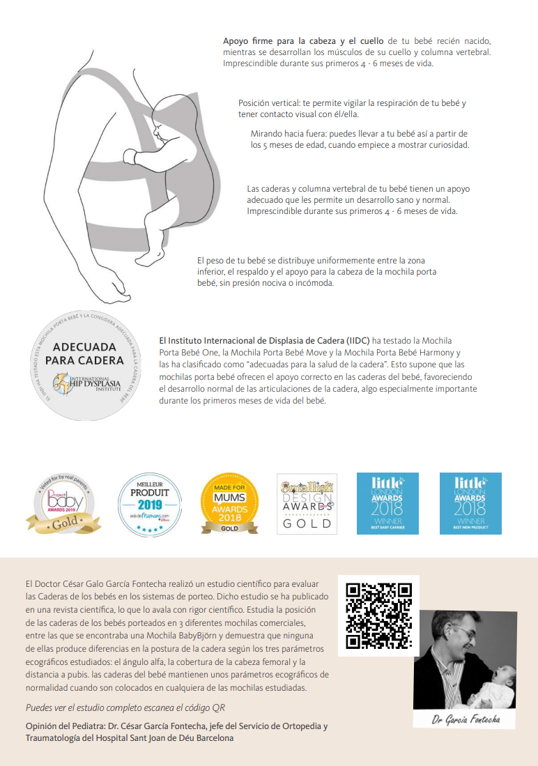 Queremos que te sientas segura/o al usar una mochila porta bebé de BABYBJÖRN. Por eso, todas nuestras mochilas se han desarrollado con la colaboración de especialistas médicos. Las mochilas son sencillas de utilizar y mantienen a tu bebé en una posición erguida con las vías respiratorias despejadas, ofrecen libertad de movimiento para las piernas y los brazos, y un apoyo adecuado para el cuello y la cabeza.