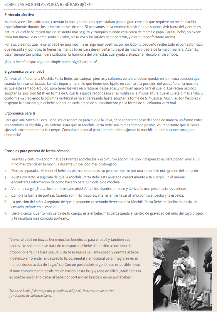 Queremos que te sientas segura/o al usar una mochila porta bebé de BABYBJÖRN. Por eso, todas nuestras mochilas se han desarrollado con la colaboración de especialistas médicos. Las mochilas son sencillas de utilizar y mantienen a tu bebé en una posición erguida con las vías respiratorias despejadas, ofrecen libertad de movimiento para las piernas y los brazos, y un apoyo adecuado para el cuello y la cabeza.