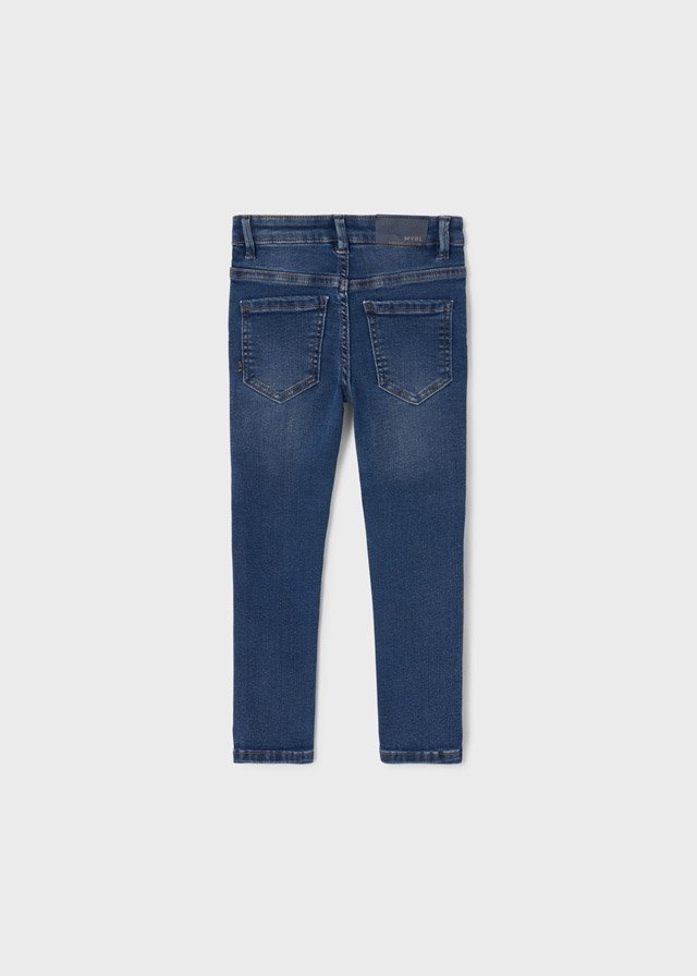 Vaquero linia algodón sostenible de mayoral color medio de la linea slim fit boton cintura ajustable como en todos modelos.