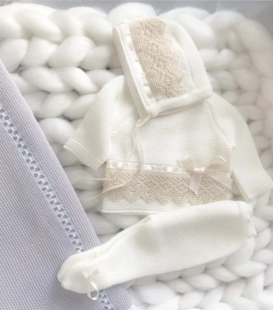 Esta colección se fabrica todo el AÑO y los Conjuntos son los mas vendidos DESDE 2018 – /2019/2020/2021/2022 con diseño propio y con hilo buscando propiamente de países bajos el más DELICADO QUE HAY , y con colaboración de una marca para tejer y cocer y fabricar a MANO estas preciosidades .