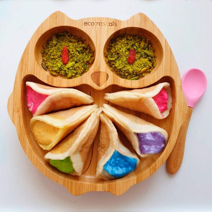 El bol viene con cuchara incluida. Los vasos los tenemos en dos tamaños, 190 y 240ml. Los de 190ml vienen con tapa de silicona con una pequeña tetina para succión y los de 240ml vienen con 2 pajitas de bambú.