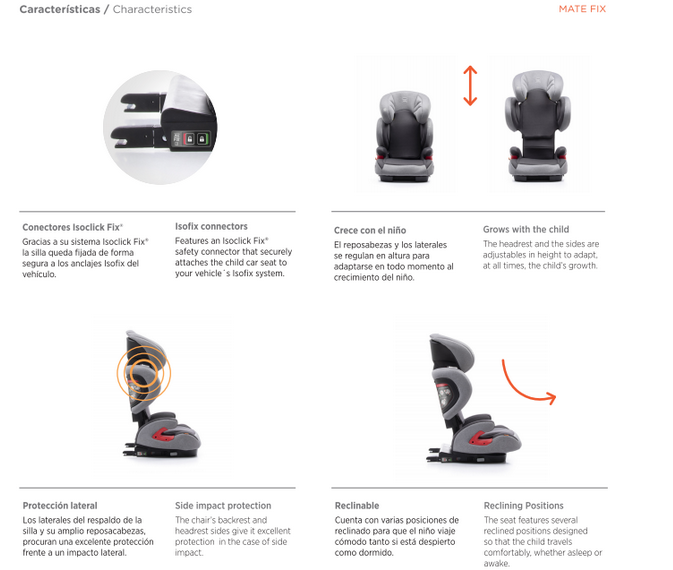 | 0+ ( 0 – 13 kg) | A contramarcha | Isoclick Fix + cinturón de 3 puntos | Arnés 5 puntos |