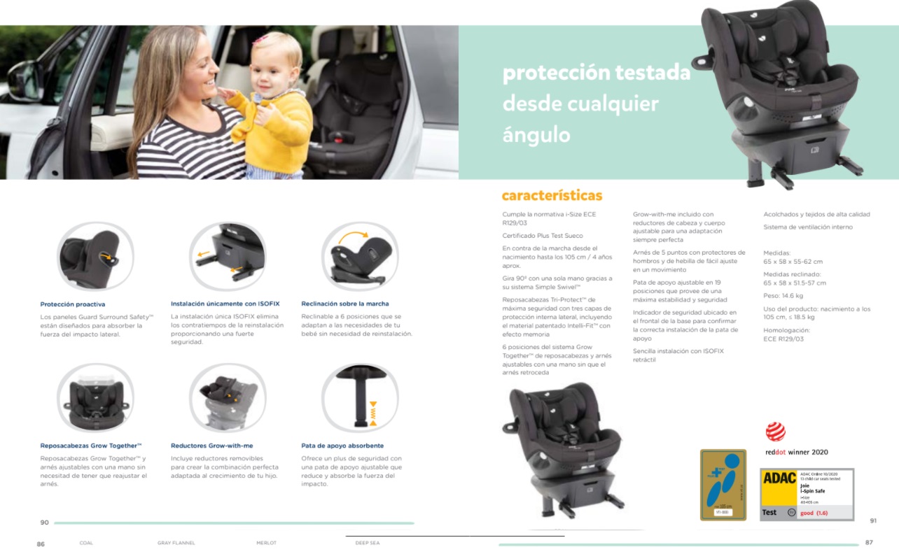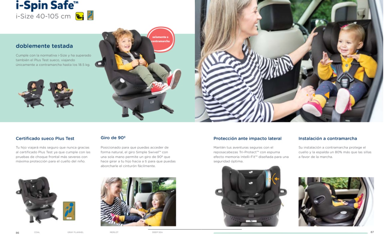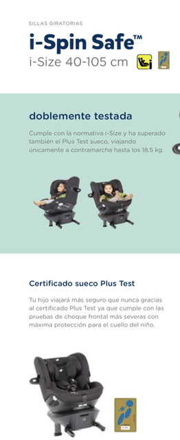 La silla i-spin safe plus test es la primera silla de auto giratoria de Joie bajo la normativa I-Size y Plus Test, desde el nacimiento hasta los 105 cm o aproximadamente 18.5 kg., con la instalación exclusivamente mediante la fijación ISOFIX a contramarcha. Además tiene una rotación de 90º hacia la puerta del coche, para colocar al peque en la silla de auto de manera más cómoda.